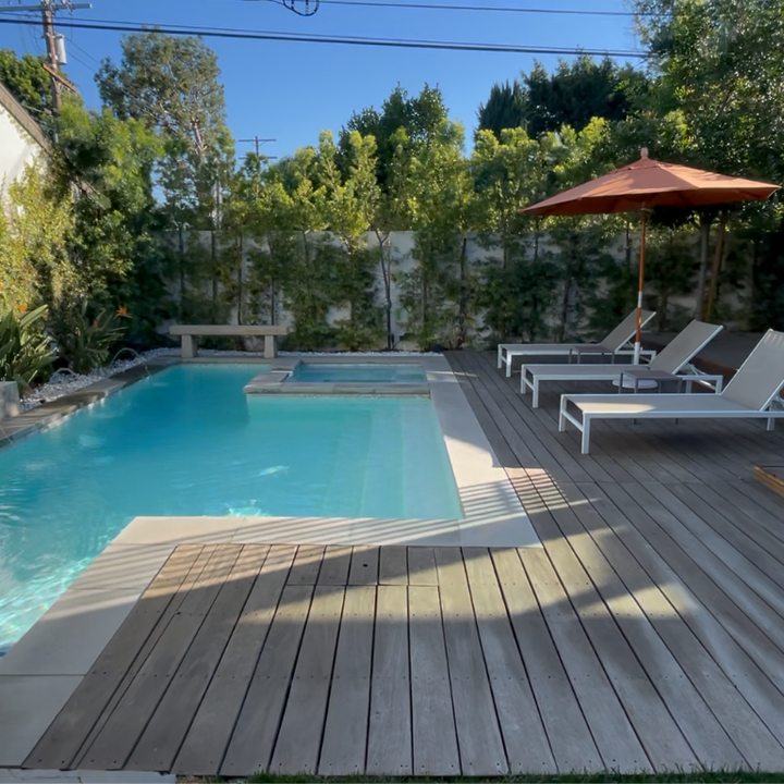 This stunningly remodeled outdoor area features a sparkling swimming pool and an integrated spa/hot tub, creating a private, resort-like oasis. The entire space is grounded by a beautiful modern wood-plank deck, which extends the living area seamlessly from the house via large sliding glass doors.
